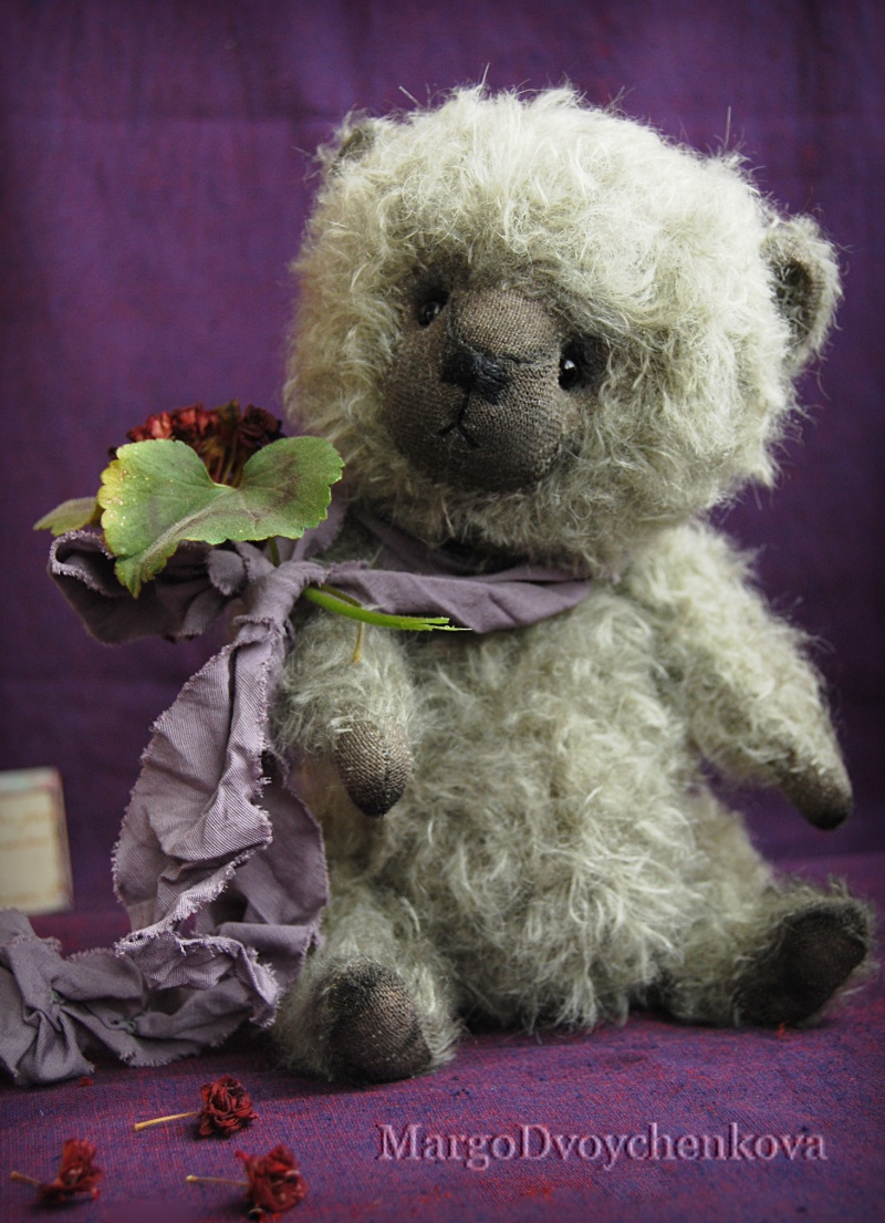 Мишка выполнена полностью вручную с использованием авторской выкройки из винтажного заваленного плюша ручной окраски и обработки, набивка синтепух, утяжелена минеральным и металлическим гранулятом, 6 шплинтов, глазки стекло, тонировка художественным маслом. Рост 28 см., сидя 22 см. Стоять не умеет, сидит с удовольствием!