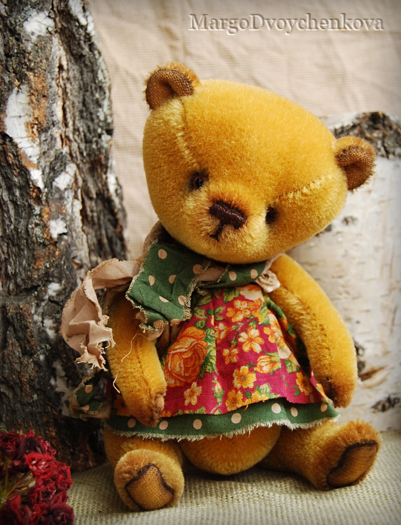Новая мишка-девочка очень летняя, солнечная и цветочная, выполнена полностью вручную по авторской выкройке из немецкого мохера-щётки, набивка синтепух, утяжелена металлическим и минеральным гранулятом, глазки стекло, 6 шплинтов, верхние лапки армированы, тонировка пастелью, художественным маслом и маркерами. Рост 25 см. стоя, 20 см. сидя, стоять самостоятельно не любит, сидит с удовольствием.