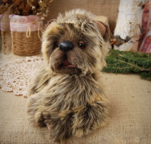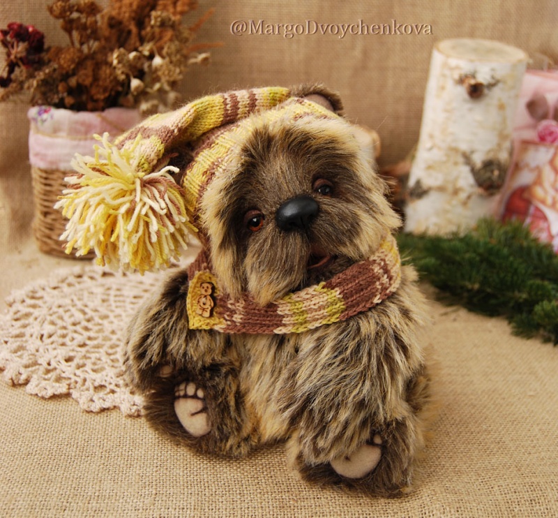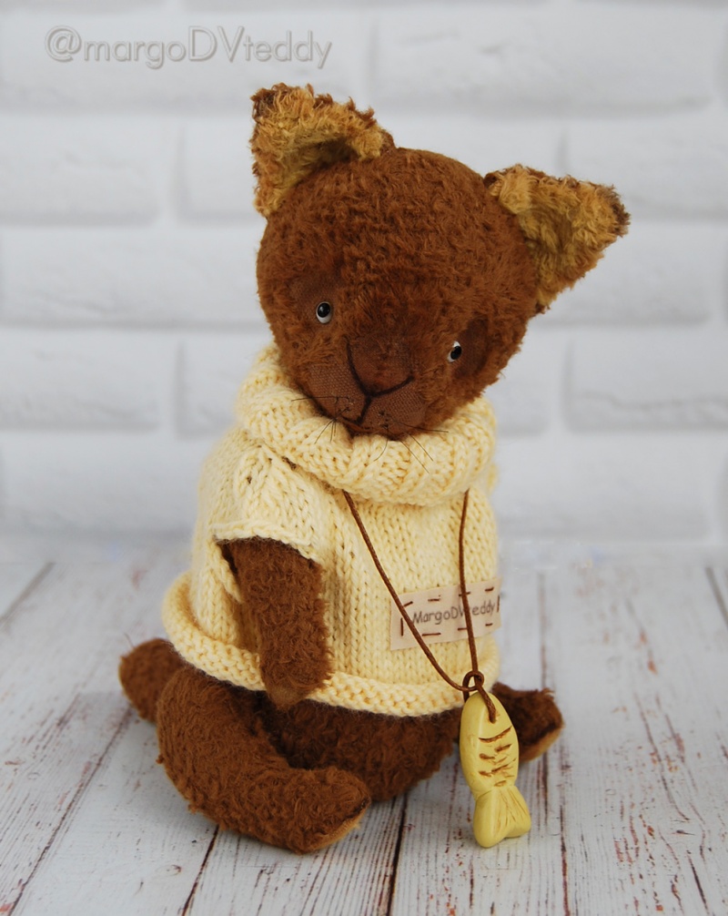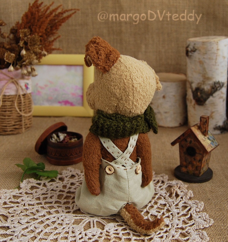 Технические подробности: выполнен полностью вручную по авторской выкройке из двух видов немецкого мохера, внутри синтепух и металлический гранулят (для утяжеления), крепления все подвижные на 6 шплинтах, глазки немецкие стеклянные, тонировка художественными маркерами. Рост около 11 см. Умеет стоять, сидеть, лежать и может принимать разные смешные позы. Имеет Паспорт игрушки.