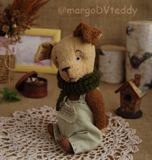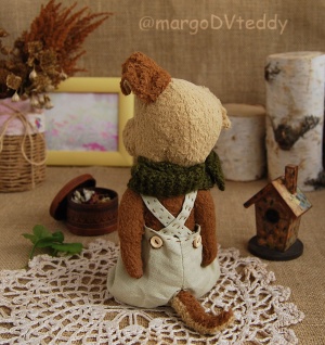 Технические подробности: выполнен полностью вручную по авторской выкройке из немецкой вискозы, внутри опилочки, утяжелён минеральным гранулятом, крепления, как у всех Тедди, подвижное-шплинтовое, головушка на двойном качающемся креплении, глазки стеклянные, тонировка художественными маркерами и художественным маслом.