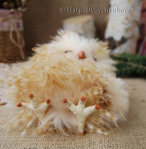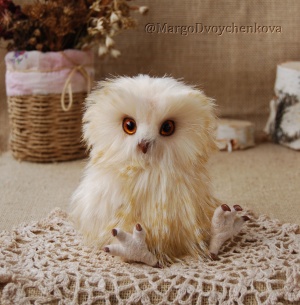 Технические подробности: выполнена полностью вручную с использованием чуть увеличенной выкройки Гуменниковой Светланы из немецкого искусственного меха, миништофа, набита синтепухом, утяжелена металлическим гранулятом, головушка на двойном шплинте, глазки стеклянные окрашены вручную с подвижными веками, крылышки армированы, клюв и коготки ручной лепки, тонировка художественным маслом и художественными маркерами. Рост 14 см. Совушка имеет документ, удостоверяющий личность - Паспорт игрушки.