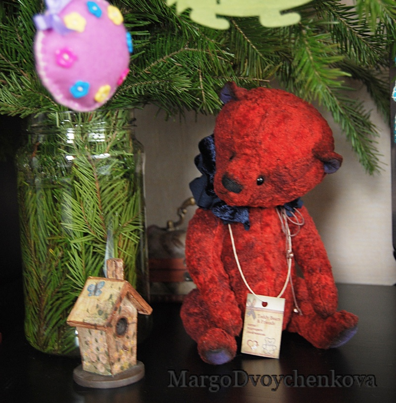 Технические подробности: выполнен полностью вручную по авторской выкройке из немецкой вискозы, внутри опилочки, утяжелён минеральным гранулятом, крепления, как у всех Тедди, подвижное-шплинтовое, головушка на двойном качающемся креплении, глазки стеклянные, тонировка художественными маркерами.