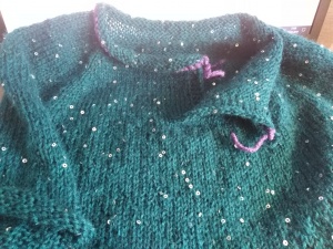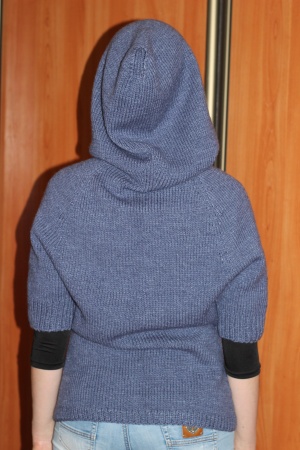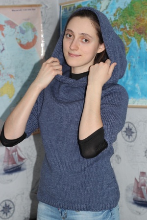 Я отвязала эту модель в приталенном варианте с укороченными рукавами и без кармана (карман не успела начать, потому что еще на этапе реглана изделие заказала Анна; она же укоротила рукава и отказалась от шнурков). Сейчас вяжу воздушную ангорскую прелесть с пайетками темно-изумрудного цвета, размер 42-44.