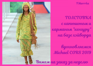 В коллекции Michail KORS наткнулась на любопытную модель. Это толстовка с капюшоном и карманом "кенгуру", связанная на основе хэйворда. Карман теряется на фоне секционной пряжи, но он есть! Роскошный капюшон с декоративными шнурками, длинные полуобъемные рукава и длина, закрывающая бедра, создают эдакий гибрид спортивной и классической модели. В прошлом и настоящем сезоне произошло смешение стилей, цветов, видов пряжи - носим все одновременно и самое лучшее!