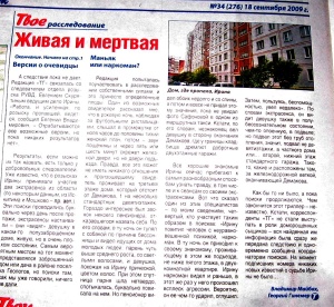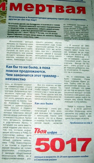 Вышла большая статья на 2 страницах в газете "Твой Городок". У корреспондентов есть своя версия, которую они уже озвучили и следствию, и организаторам поиска. Посмотрим, чем это закончится.