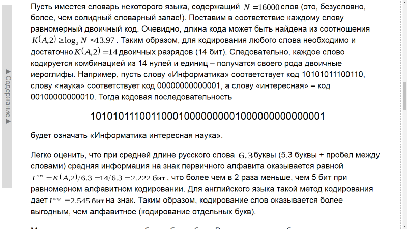 5 бит/букву умножить на 6,3 букв/слово = 31,5 бит/слово – затраты битов при алфавитном кодировании. Это более, чем в 2 раза больше, чем 14 бит, требуемых при кодировании слов “двоичными иероглифами”.