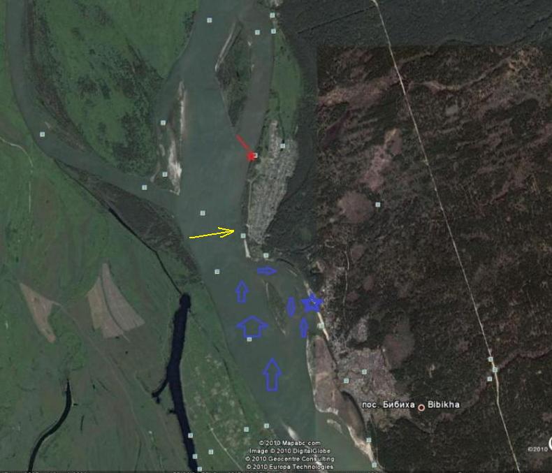 Синяя звездочка, где раньше стоял дебаркадер, а синии стрелочки, как к ним подходил теплоход