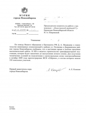 Обращаюсь к Вам с просьбой помочь жителям Дзержинского района г.Новосибирска с решением вопросов жизнеобеспечения. Дело в том, что Администрация города Новосибирска предоставила земельные участки (порядка 1500 участков) для строительства индивидуальных жилых домов, гарантируя подведение инженерных коммуникация, таких как электроэнергия, водоснабжение (основное что необходимо, без канализации и газа уж как-нибудь проживем). Обычные люди уже строятся и много домов уже построено, но жить в них не представляется возможным, т.к. не даже электричества!! (выкручивается кто как может: кто бензогенератор себе купил, кто при свечах живет, цивилизация уходит в прошлое!)! Электроподстанцию, уже третий год!! администрация обещает построить, но подстанции так и нет, уже зима и перспектив так и невидно. (в начале каждого года заверяют, что деньги выделены, а концу года результата нет).