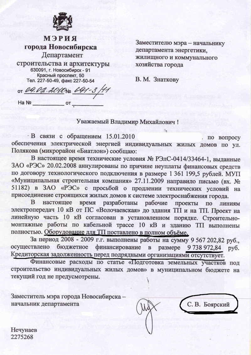 Выкладываю письмо мэрии где говорится ,что оборудование куплено и поставлено! Где оно? Коробка подстанции стоит без оборудования! Я думаю это оборудование уже стоит где-нибудь на линии к коттеджному поселку какого-нибудь зама. Освоили 10 млн….на что именно освоили. Построили коробку подстанции…. Это с натяжкой и откатами 2 млн потянет, где еще 7 млн? Где деньги Зин! Рассчитались с подрядчиками? Ну-ну. То-то подрядчики два года строили коробку 10*10м. И то наверное в нагрузку к какому то либо объекту коробку им эту подсунули. Все прекрасно все довольны, коррупционеры