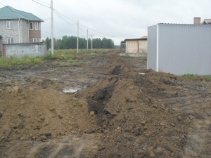 Всё в глиняной каше, "лишняя" глина брустверами осталась... Лопатой её растаскивать, что-ли? По такому "переулку" разве что на вездеходах можно проехать.