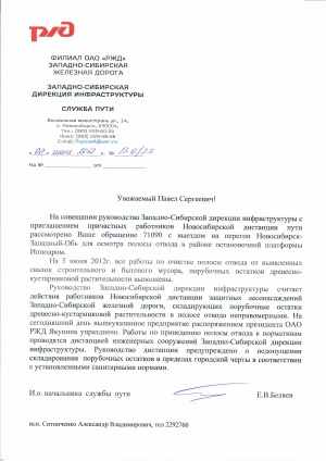 Не помню писал тут или нет, но был такой случай по весне... Работаю на стройке дома и вижу какое то движение в лесополосе железной дороги. Подошел и вижу, что мужики в форме железнодорожников валят ветки в полосе... а вокруг все как на свалке завалено всяким мусором. Я с ними поговорил на тему незаконности их действий и выяснил, что им приказал начальник валить именно там, а по осени сжечь, что и то и то незаконно. Приехав вечером домой зашел на сайт РЖД не без труда отыскал там форму для обращений граждан и чирканул им письмецо с описанием нарушения и угрозой в следующий раз вырвать ноги этим мужикам, а на РЖД в прокуратуру написать.