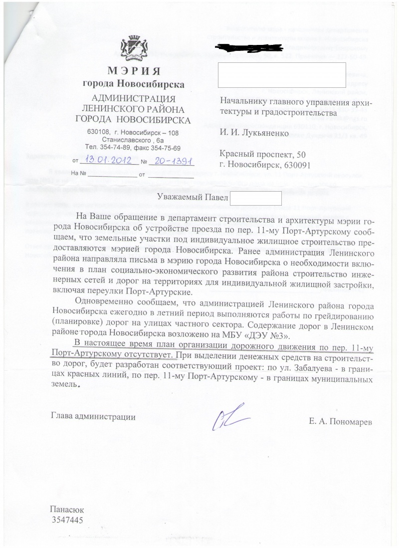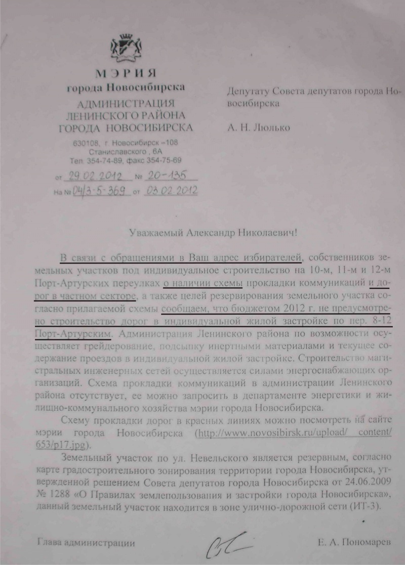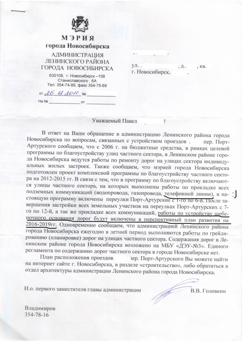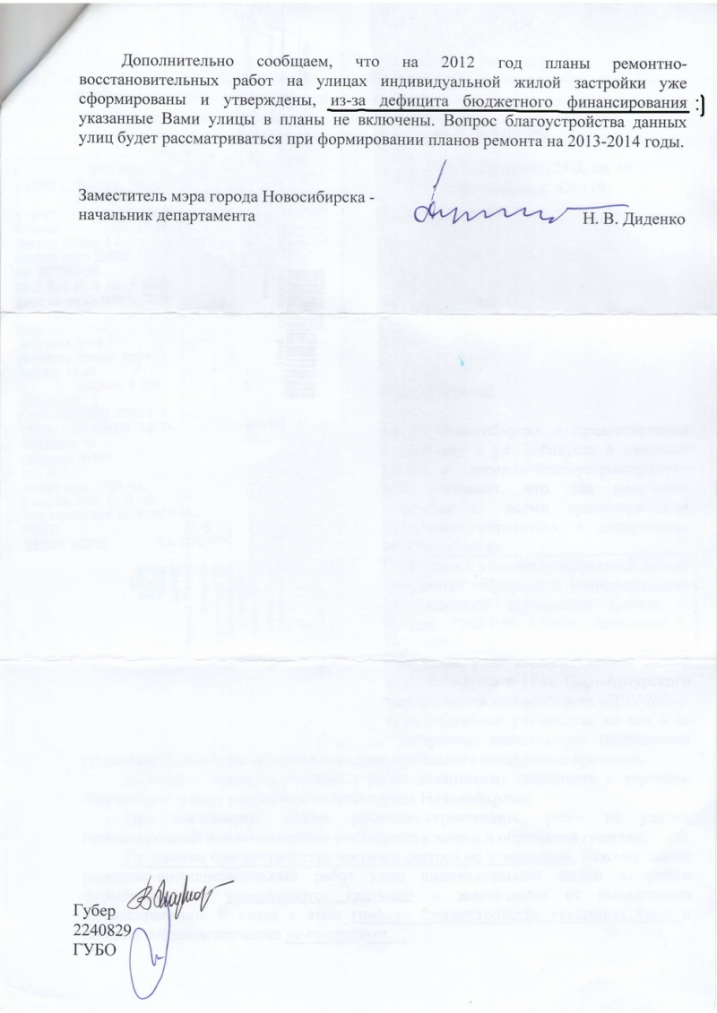 Я просил изложить несколько моментов по поводу кто и когда будет планировать и делать дороги в нашем ауле. Так же просил предоставить схемы и планы на тот случай если жители сами будут делать дороги. Просил предоставить кусок "программы благоустройства частного сектора на 2012-1015 год" на которую судя по публикации на сайте мэрии г Новосибирска в бюджете заложено не много не мало 3,154 млрд руб.