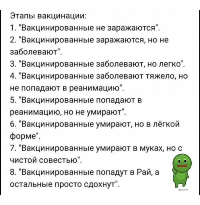2. медотводы придумали не просто так, и они есть даже у животных, а у людей вдруг нет. о как. медицина опустилась на уровень ниже ветеринарии. А если бы больных, хромых, косых не тыкали и не было всех этих историй, "вот брату дяди поставили и он умер через час", а их дофига и нет это не иноагенты их распространяют, а живые люди и я, к сожалению, тоже столкнулась с тем что вот был человек и не стало. Если бы все делали по правилам, осложнения были единичные приединичные и народ бы не ссал, это просто инстинкт самосохранения. Ну и если бы в инфопространстве как то следили бы за фейками о монстрах в вакцине из графена)) подключения вакцинированных к вай фай, о магнитящемся месте прививки и др. это явный вброс и тёмных и дремучих людей из провинции очень пугает. Создается впечатление что идет мировая биологическо-информационная война, но пока не понятно кого хотят выпилить тех кто напугался или тех кто дофига умный.