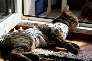 Лапочка, намучалась. Люба, теперь смотри, что бы попону не сдергивала и языком не шарила, где швы.