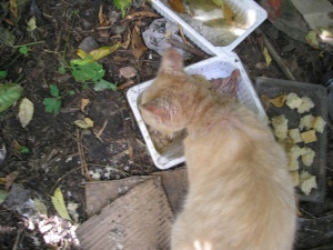 В результате очередного звонка "у нас в подвале похожая кошка" 16.07.11 поздним вечером (было где-то около 23 часов) я вместе с подругой пошла в этот подвал. Нашли кошку очень похожую на мою Майю, но при уличном освещении оказалось, что это не она (на лапках грязно-серые носочки). Вместе с кошкой нашли котёнка (возраст примерно 2,5 мес.). Обоих принесли домой.