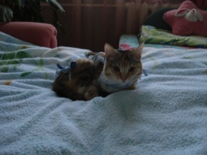 К середине ночи их (я так подозревая) начало морозить и они поползли ко мне "на ручки" (во что превратились мои ножки ) - два бессознательных животных, по 3 кг весом, пытались разместиться и закрепиться у меня на коленях одновременно. Зрелище сердеценадрывное, что уж тут скрывать. При этом старшая все ещё не оставляла попыток рвануть в сторону.