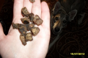 Я по совету Юли Yuldus для Чармуна печень говяжью делала ( только оказалось недосушила ) , Чармуну то понравилось, но на печень у него морда вся красная и лапы грызет