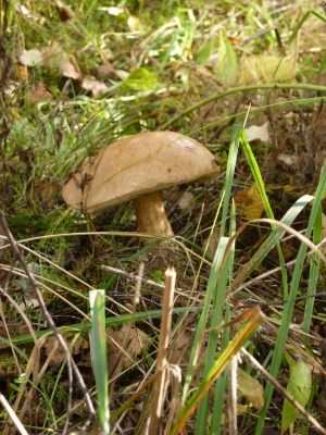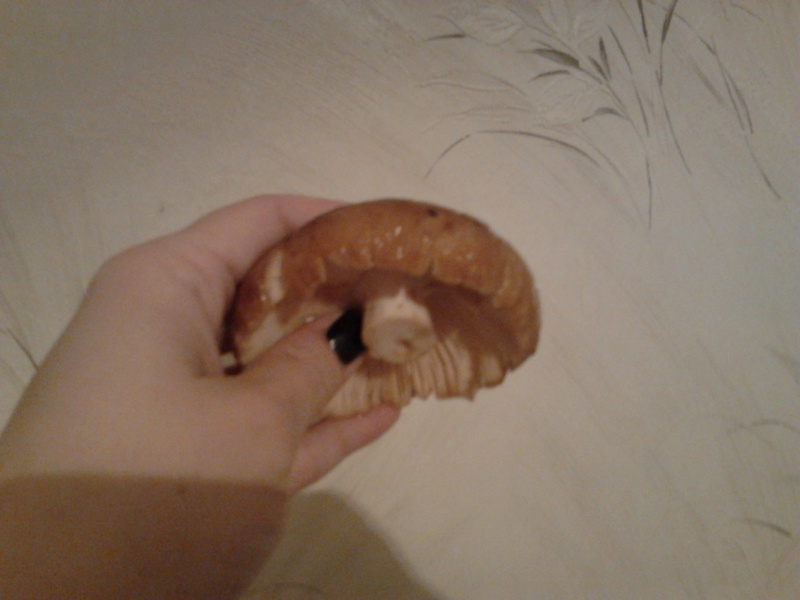 Посередине была дырочка...я подумала , что червячок поел))) У него шляпка коричневатая...пластинчатая, а ножка короткая, примерно как у груздя...