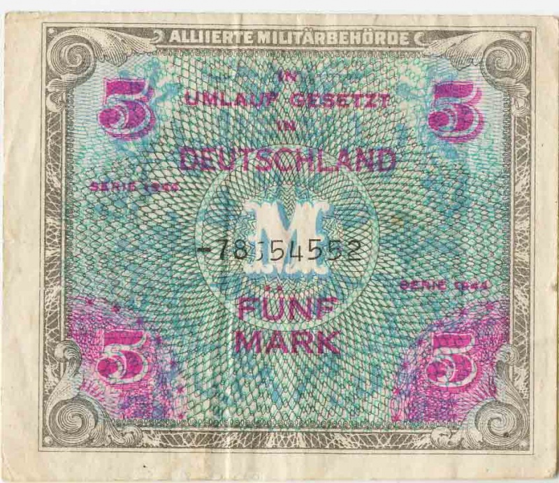 А вот это не является тоже каким-либо оккупационным дензнаком?Очень может быть. Я таких никогда не видел, но у нацистов (это кстати не их придумка, раньше тоже такое бывало) существовала практика делать надпечатки на купюрах, которые уже ходили в той или иной стране до оккупации. Возможно это такой пример. Но достоверно утверждать не возьмусь...