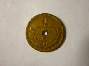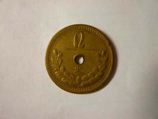 Монгольские 2 мунгу 1925. бОльшая часть монгольской меди - сверленная. Как я слышал, бурятские ламаисты какой-то фетиш из них делают...