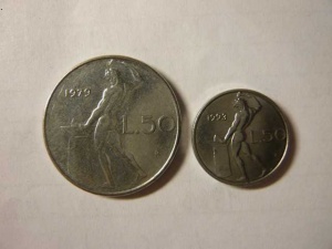 Лиры дешевели жутко и металл стал стоить дороже номинала - вот и урезали размер. у нас же тоже с этого года ВСЕ монеты стали стальными, а не медно-никелевыми или латунными