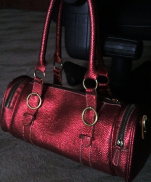 красная с перламутровым отсветом сумка, внутри что-то типа мягкого велюра бежевого цвета,сделана такой колбаской, есть два кармана с торцов, длина 35см, обменяю на банку варенья или большой тюбик универсального клея Момент