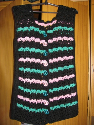 вязаная удлинённая безрукавка(моя работа, вязала для себя, на совесть как говорится, оценена в 600руб. без работы, хорошие пуговки в виде брюлликов 25 р. одна шт.), 44-46 р-р.