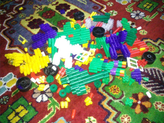 два детских конструктора - на одном лежат ножницы, чтобы показать масштаб - обменяю на банку домашнего варенья