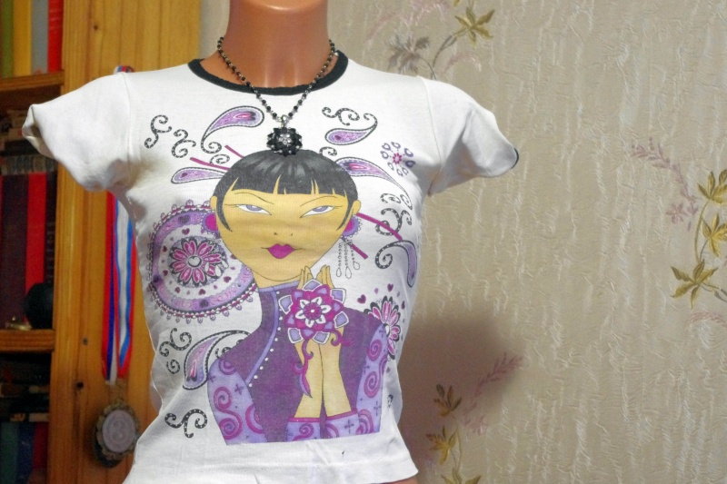 футболка с принтом на девочку (носила примерно в 12-14л.), внизу справа немного распоролась по шву;