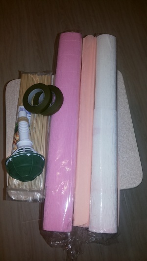 2 рулона гофре и одна - мелкое гофре. Плюс палочки (предполагалось, для цветов), скотч зеленый и подставка для букетов. Всё это когда-то должно было стать цветочками, но не стало
