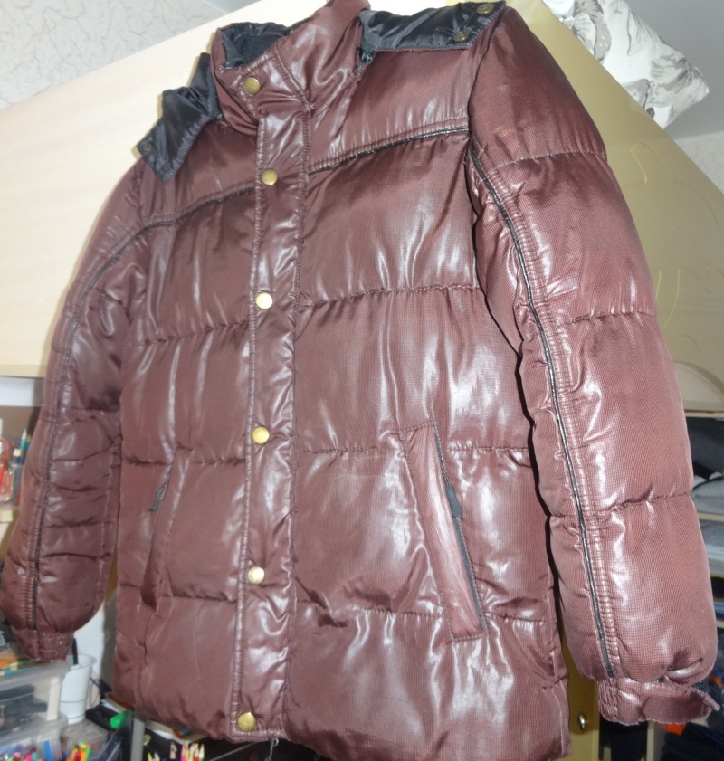 1. Пуховик мальчиковый, коричневый, б/у, сзади есть небольшая коцка, почти невидно. (мой парень всю зиму из него не вылезал), наполнитель что-то типа тинсулейта
