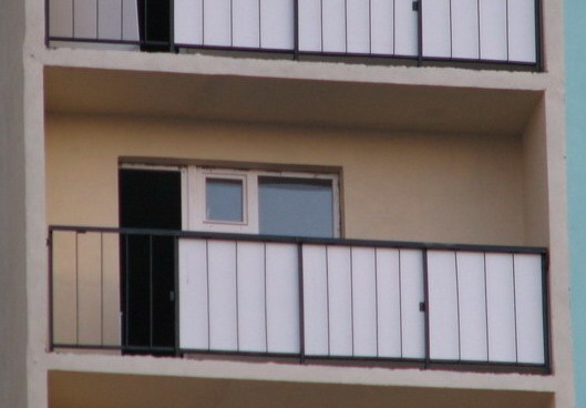 имеется прямоугольная (без выпуклостей) лоджия длиной 4.4м, в качестве ограды - металлическая кострукция из уголка с металлическими листами (см фото)