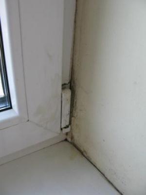Угол между окном и стеной (гипсокартоном)/откосом, там где петли находятся, не знаю как правильно написать. Причем только нижние углы такие, верхние нормальные. Но это вдимо из за того, что конденсат то вниз течет.