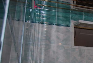 3. Купить плитку - это большая проблема. Типичные проблемы: "у нас только 5 коробок этой плитки", "у нас нет этого бордюра" и т.д. В итоге пришлось брать темную плитку двух разных тонов. Благо она наклеена на противоположных стенах, одновременно не видна и разделена в одном случае жалюзями, в другом - полосой из белых плиток.