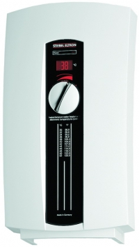 Проточный водонагреватель закрытого типа (напорный) с электронным управлением, предназначен для снабжения одной или нескольких водоразборных точек. Нагревательный элемент — медный ТЭН. Элементы прибора, контактирующие с водой, выполнены из меди. На лицевой панели прибора размещен регулятор выбора температуры с диапазоном от +З0 °С до +60 °С, и индикатор питания. Модель DHC-E 8/10 имеет возможность коммутации мощности 6,0 или 8,1 кВт. Минимально необходимый проток 1,4 литра в минуту. Встроенная защита от перегрева. Температура воды на выходе регулируется протоком с помощью смесителя и регулятором выбора температуры.