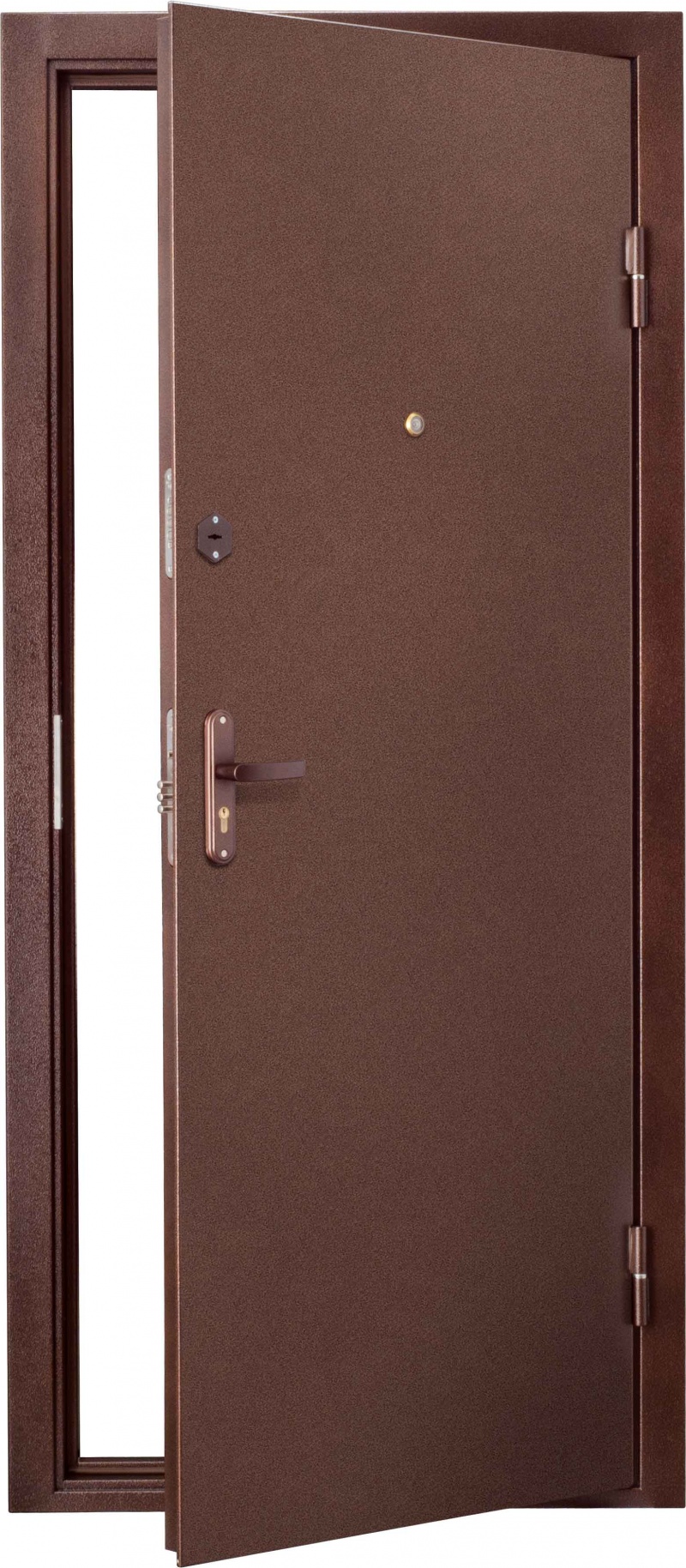 2. Дверь мет. утепленнная 1000х2100, сталь 2мм, правая, сложный короб, 2 замка+ночная задвижка, броненакладка, ручка нажимная, 3 шарнира, глазок, противосъемники, полимер антик-медь (мелкий), сталь 2мм, рисунок РУСТ на лицевой стороне цена 18000р.