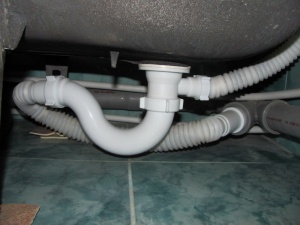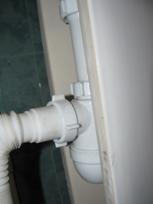 Труба сифона диаметром 32 мм. Если у вас канализационный выход больше, это можно скомпенсировать резиновым переходником.