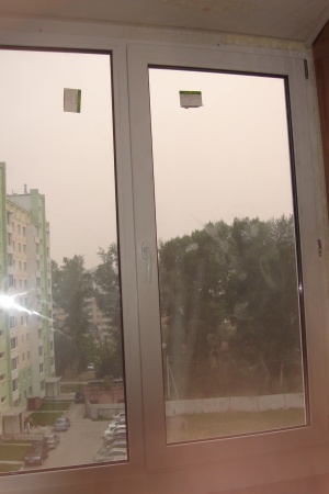 Размеры 2,95 х 1,65. Трехстворочное окно с одной рабочей створкой.