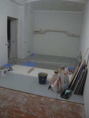 старый пол (прочный без пустот) - фанера - ГВЛ - пропитка - кафель.