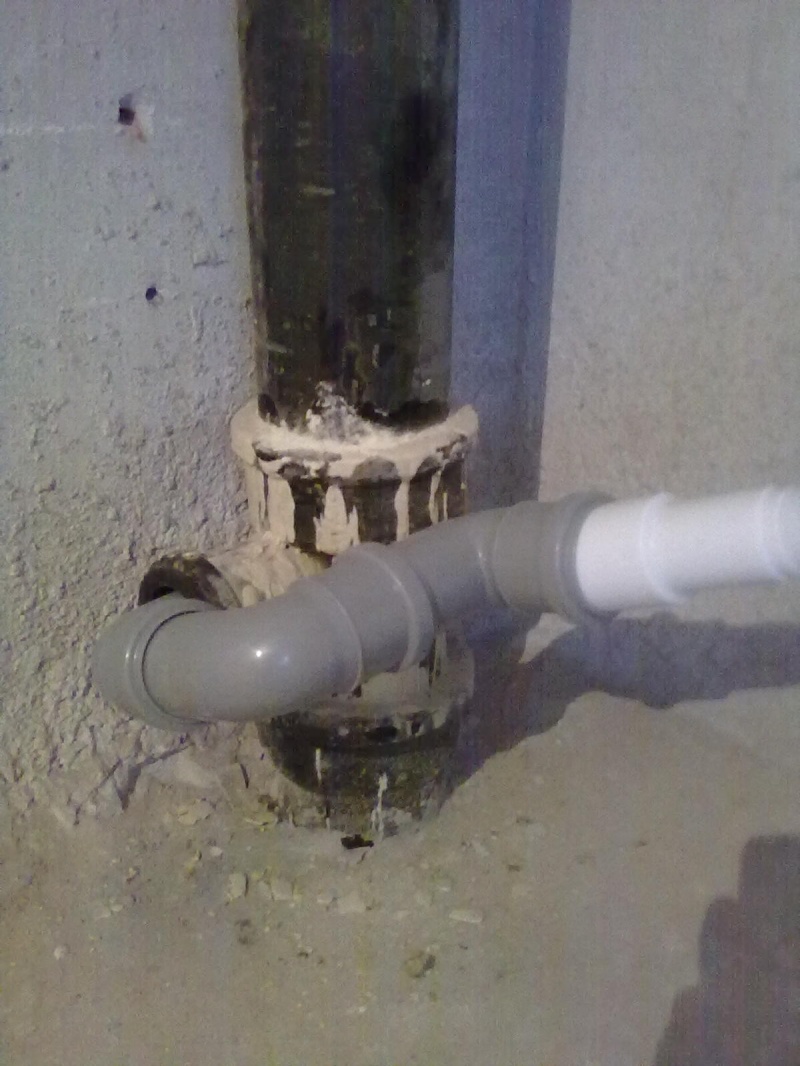 1) Есть чугунный стояк, необходимо повернуть тройник на 90 градусов. Соединения залиты чем-то желтым.