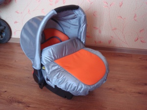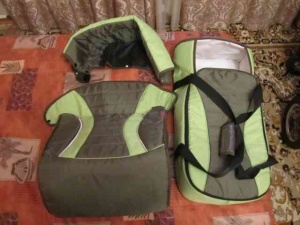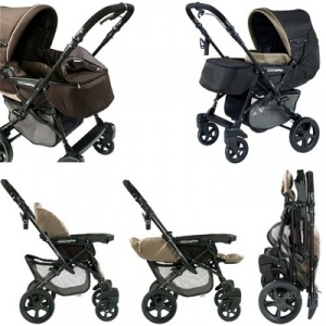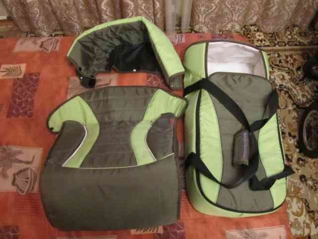 В комплекте переноска с жестким дном, противомоскитная сетка, солнцезащитный козырек, дождевик, накидка на ноги, сумка, автокресло от 0+