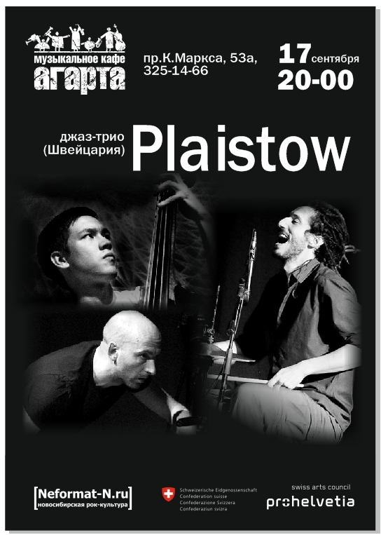 Приглашаем вас в музыкальное кафе Агарта на концерт швейцарской джазовой команды Plaistow! Впервые российский тур группы простирается "за Урал" и нам выдается уникальная возможность услышать Plaistow вживую!