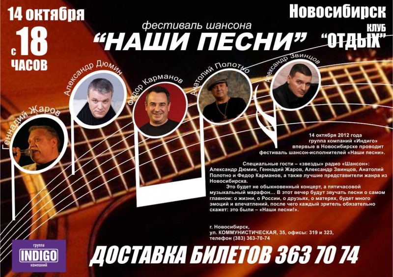 14 октября 2012 года в клубе "Отдых" группа компаний "Индиго" впервые в Ноосибирске проводит фестиваль шансон-исполнителей "Наши песни!".