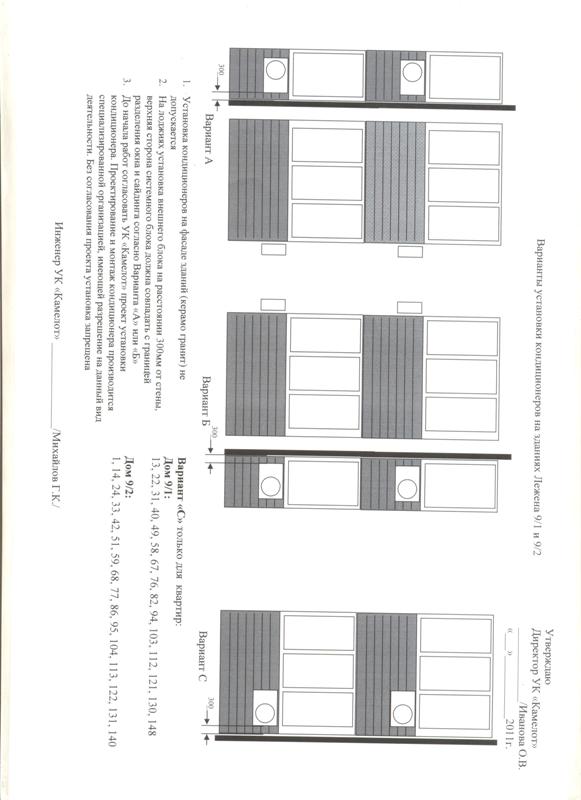 Говорят, что такое требование появилось после того, как кто-то (как я понял из наших домов) установил кондер при помощи джамшутов и он якобы отвалился и мог бы кого-нибудь покалечить. Ну не знаю... строго говоря, установка кондера - это вообще считается перепланировкой помещения со всеми вытекающими. Другое дело, кто бы у нас об этом вспоминал при установке? а тут столько строгостей. Ну что ж - оставим за собой право тогда и с УК строго спрашивать за неработающие лифты и отсутствие воды.Данную историю я тоже слышал, выкладываю бланк вариантов установки блоков кондиционеров (ну не получается у меня на нашем сайте это сделать наикак :o)