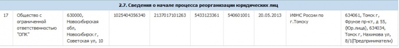 Информация о реорганизации ООО "ОПК" в форме присоединения к другому ООО достоверна. В ЕГРЮЛ внесены сведения о начале процесса реорганизации юридического лица ООО "ОПК" (ОГРН 1025404356340, ИНН 5433123361, КПП 540601001) 20 мая 2013 г. Сведения внесены ИФНС России по г. Томску, адрес: г. Томск, пр-кт Фрунзе, д 55.