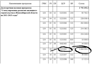 Смотри картинку - это вырезка из бюджет НСО на 2013 год, программа "Долгосрочная целевая программа "Стимулирование развития жилищного строительства в Новосибирской области на 2011-2015 годы"