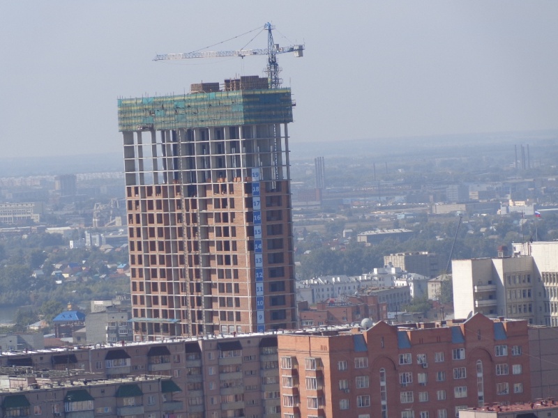 Остеклили по 10 этаж. Выкладывают кирпичом стены 20 этажа.