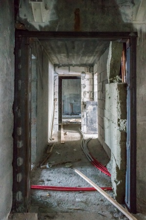 На первом этаже во всех подъездах всё больше перегородок, частично смонтированной сантехники и укрепленных дверных проёмов.