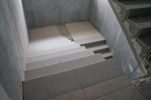 В третьем подъезде от второго до пятого этажа положена плитка! И на лестнице тоже! Пропущена только одна полоса посредине на промежуточных площадках, видимо, технолония такая. Ну и с торца лестниц тоже пока ничего. Плитка совсем светлая, стены тоже (кажется, местами уже на чистовую), выглядит довольно радостно.