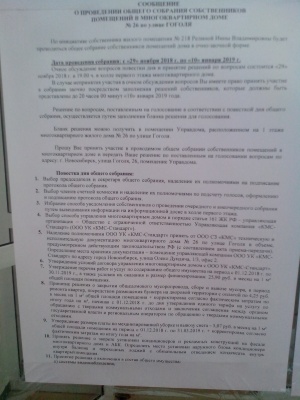 На дверях дома повесили повестку дня собрания, которое будет 29 ноября. Предлагают голосовать за УК КМС-Стандарт. Тариф на текущее содержание предлагают 25,90 р/м2. Но за то доплата, за это доплата и по итогу получается 40,53 р/м2 (!!!!).